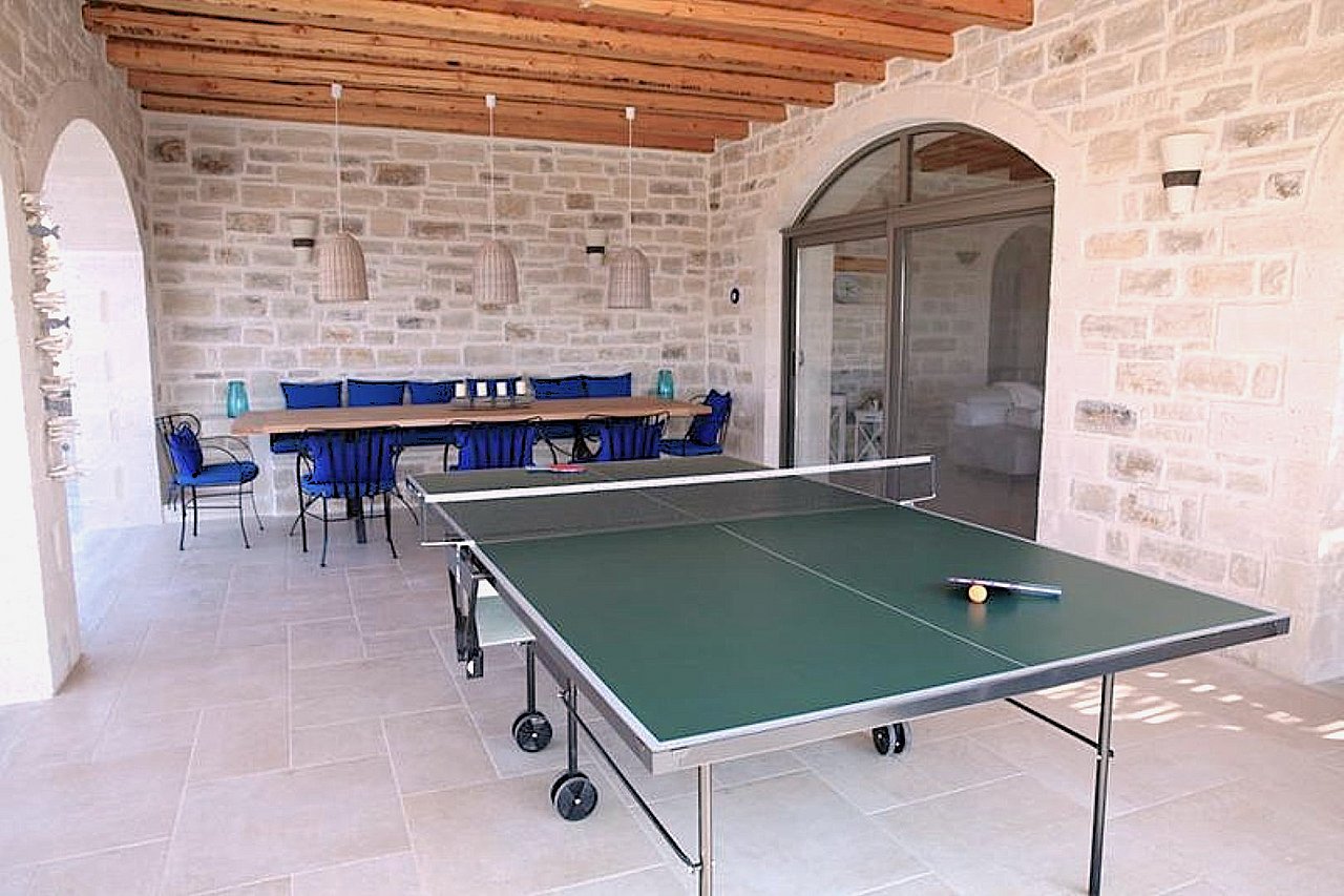 You can unwind here! The villa is equipped with 8 comfortable loungers. Large sun umbrellas and the shaded terraces provide for shade. The garden was created with olive trees and Mediterranean plants. There is a playground with a sandbox and swing for our small guests.