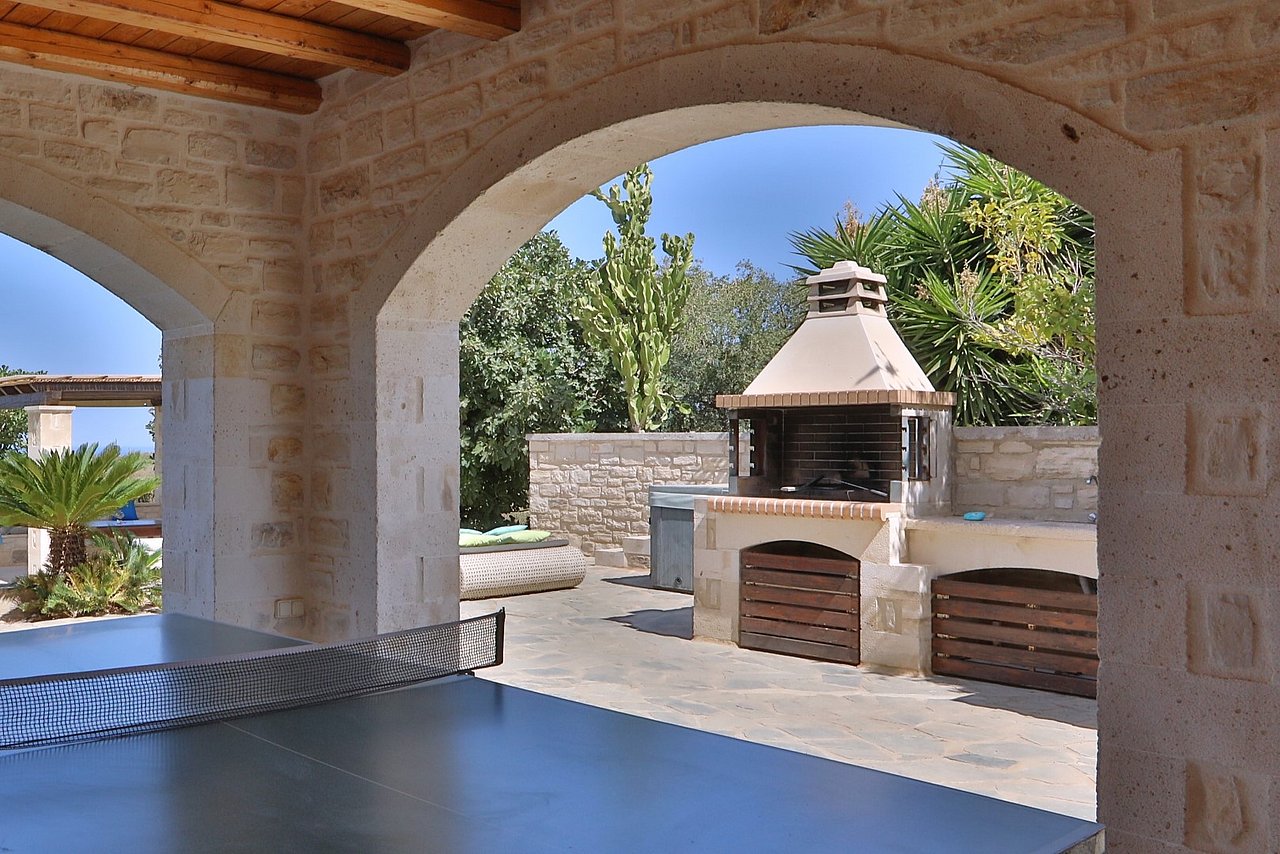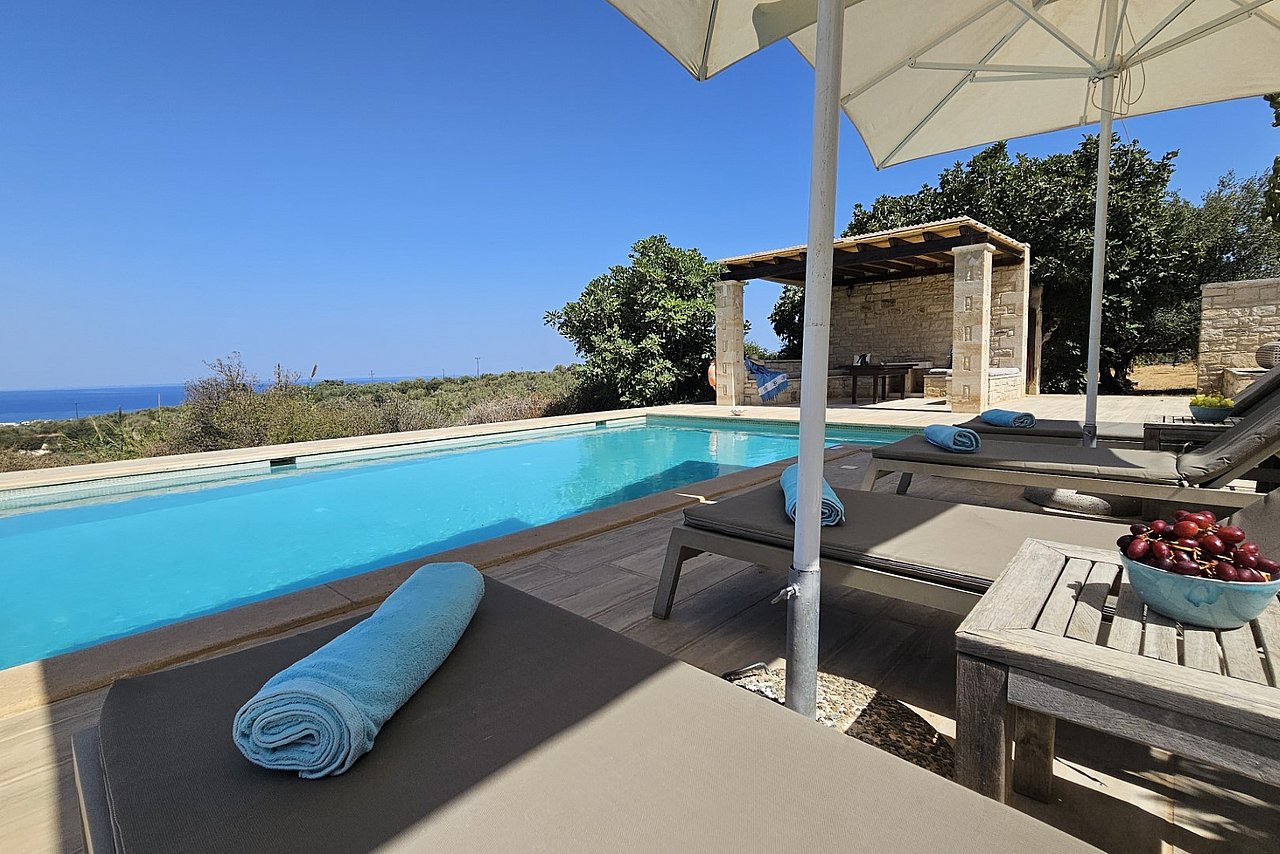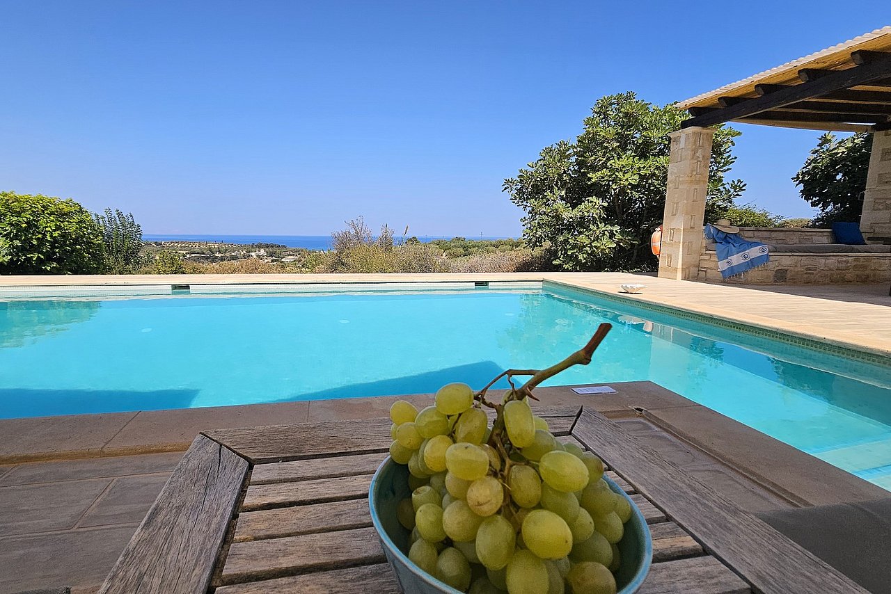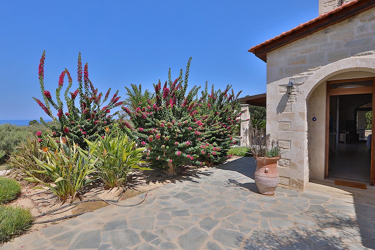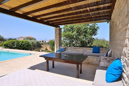 The villa has a wonderful view, tranquillity and a central location. It is located on the edge of the villa and through this you can also walk into the village. 400 m away in the traditional 'the polio house', a well-known tavern on Crete, in which you can enjoy traditional cuisine under shade-providing trees. Furthermore, there is a small mini-market and a Kafenion. Other taverns are found in the surrounding villages and in Skaletta, which is just 2 km away. Here you can eat directly on the beach as well.
