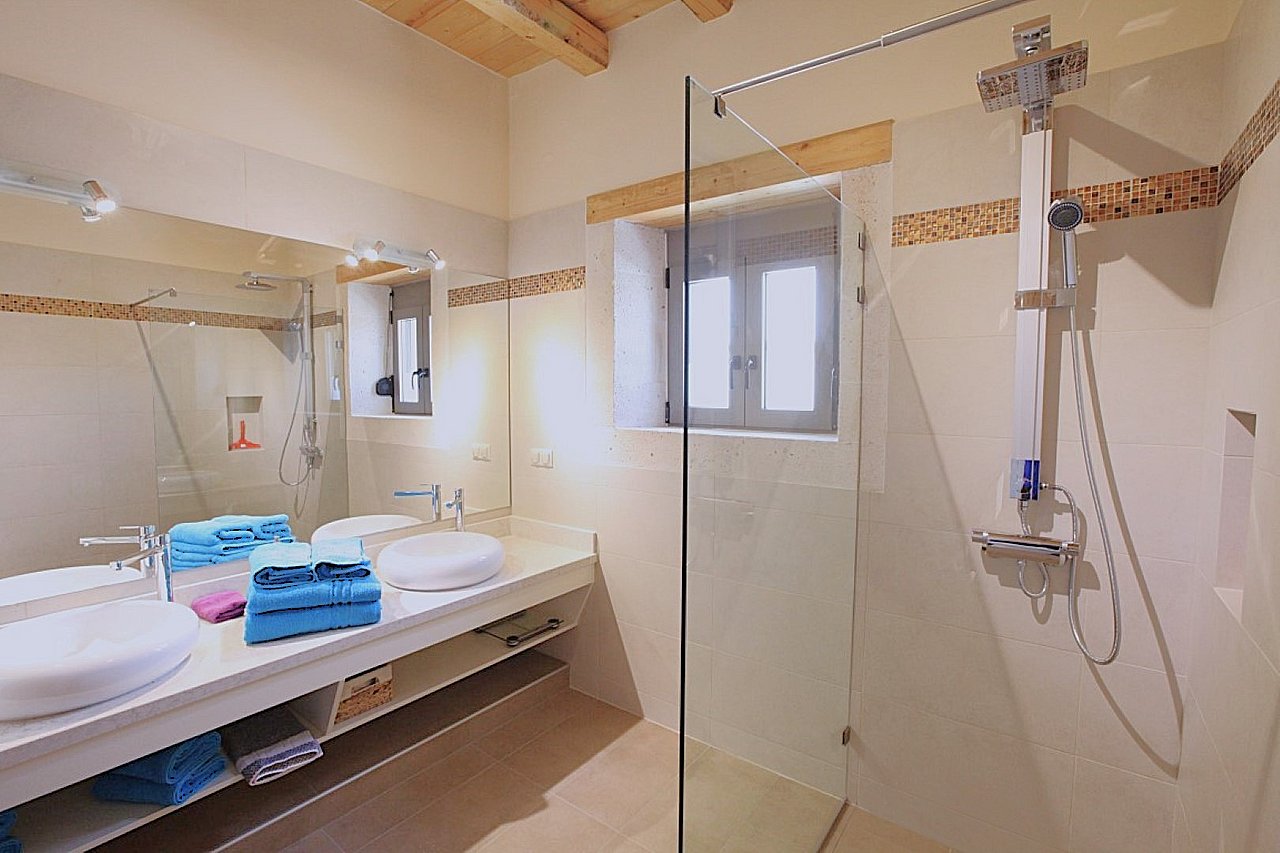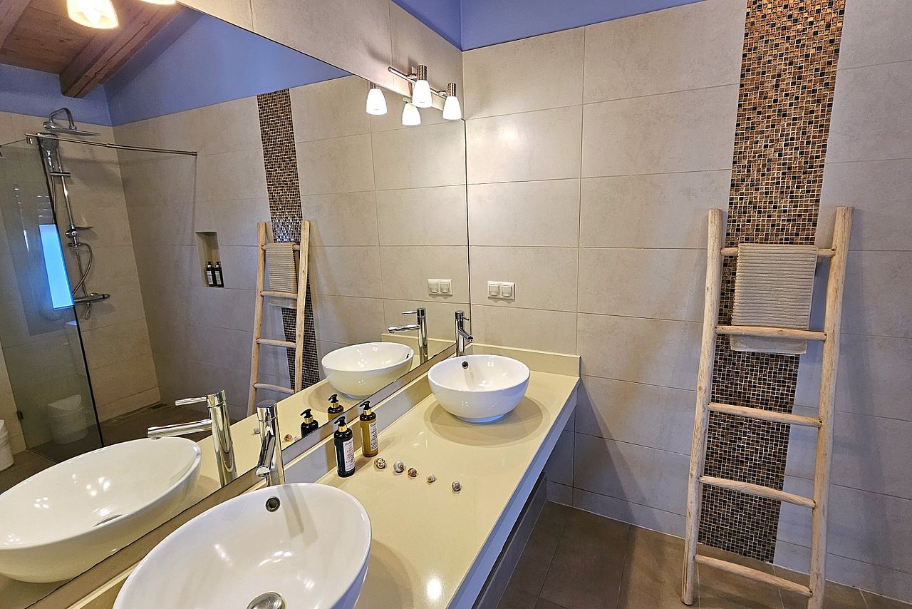 On the top floor, there are three spacious bedrooms with double beds and each with an en-suite bathroom. The largest bedroom with about 30 sq. m has an open bathroom with a shower and bathtub as well as a separate WC with bidet. The double bed is 2x2 m. From here you have access to the large, shaded terrace (over 30 sq. m), which only belongs to this bedroom. Here you will find a large outdoor shower with warm and cold water. Thus, you can also enjoy the view of the Mediterranean Sea while showering. You can relax on the two loungers. The second bedroom also has a double bed with 1.80 x 2 m and a bathroom with shower. This bedroom has a balcony. The third bedroom also has a double bed 1.80 x 2 m and has a bathroom with a shower. There is a balcony and a roof terrace.