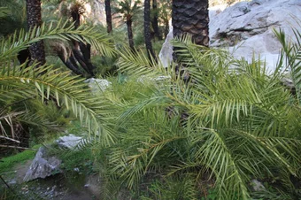 Hinter dem Strand bildet der Megalopotamos, ein aus dem Kouroupa-Gebirge kommender Bergbach, den kleinen Teich - oder See von Preveli, der sich bis in die dahinter befindliche Schlucht hineinzieht. Die Kretische Dattelpalme (Phoenix theophrasti) bildet hier einen natürlichen Palmenhain.
