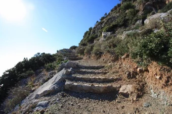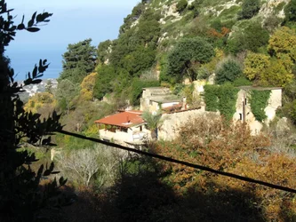 Ausgesprochen hübsches Kloster, weitab von jeder Ortschaft inmitten der schroffen Felslandschaft. Ringsum herrscht nur spärlicher Baumwuchs, öde Macchia und verkarstete Steilhänge ziehen sich zum Meer hinunter. Vor wenigen Jahren hat leider ein Feuer den geringen Pflanzenwuchs dezimiert.