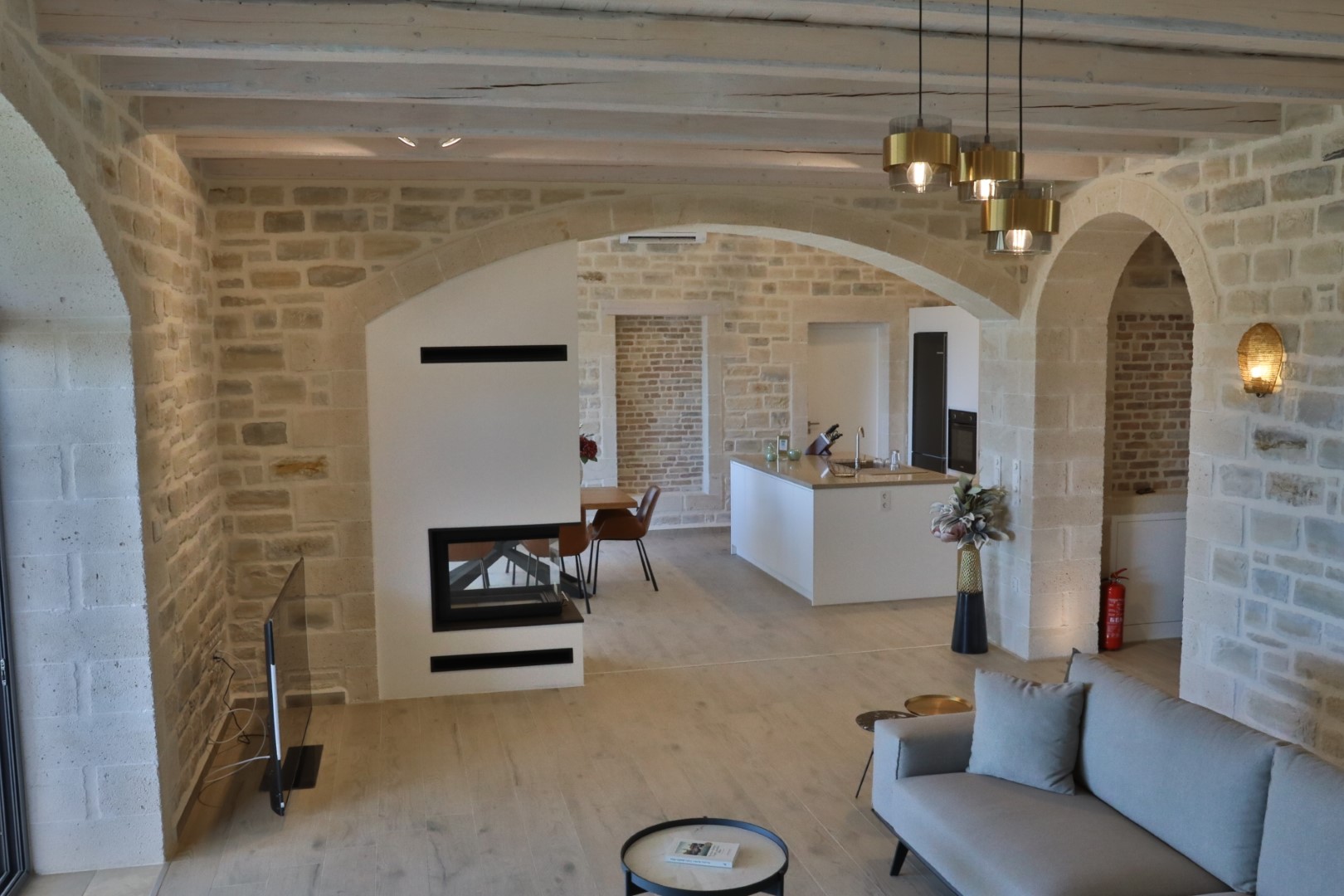 • Edles Interieur mit Kamin, Naturstein und maßgefertigten Möbeln