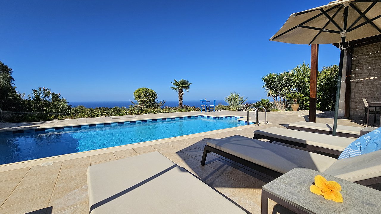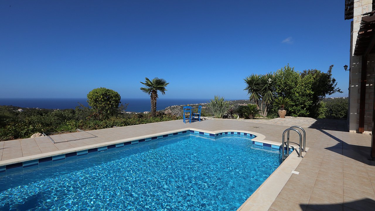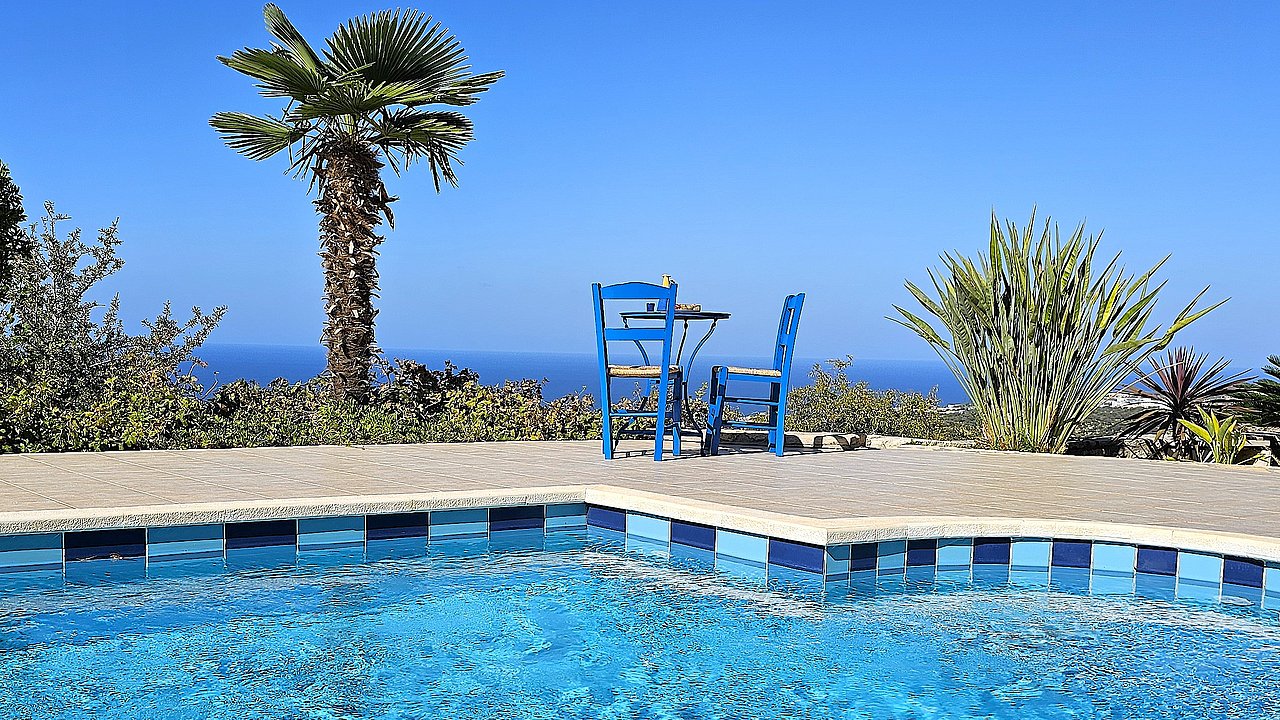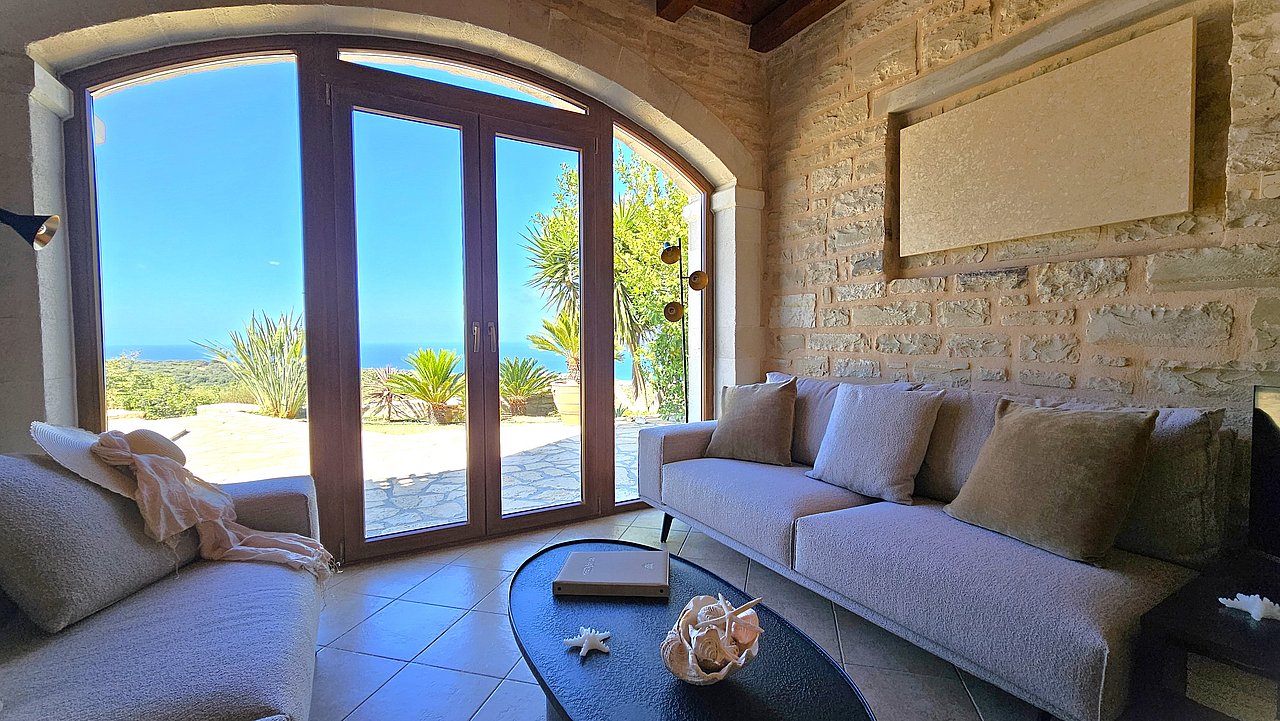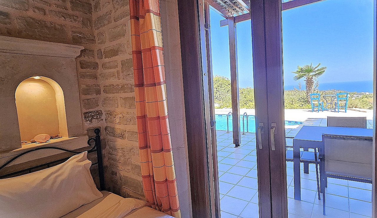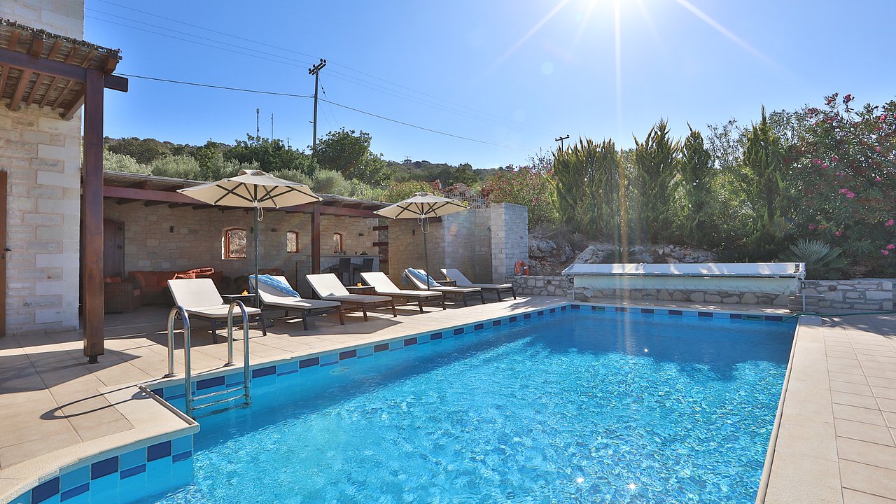 Familien oder Paare, die eine traditionelle Natursteinvilla mit privatem Pool, mediterranem Flair und Meerblick suchen – in ruhiger Lage nahe Gerani und Rethymno.