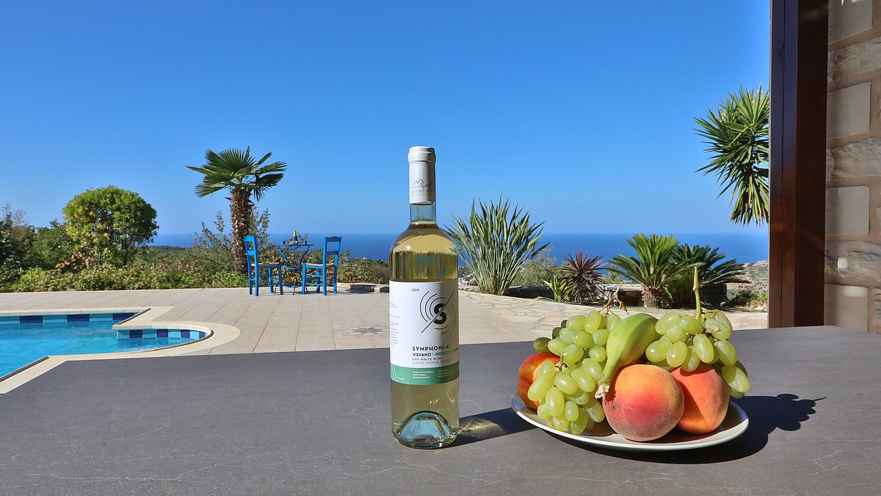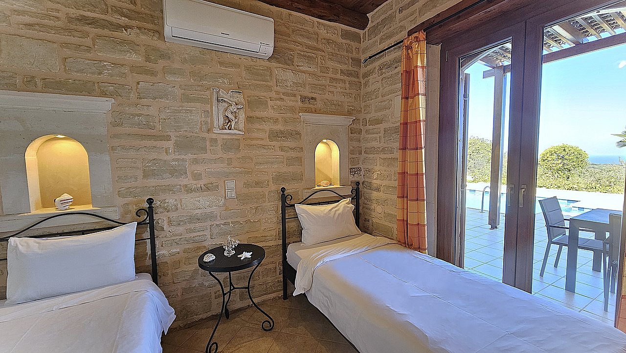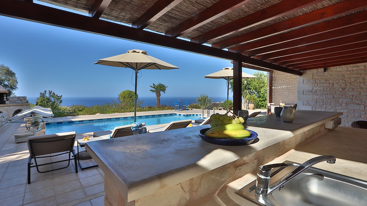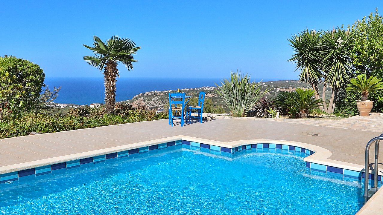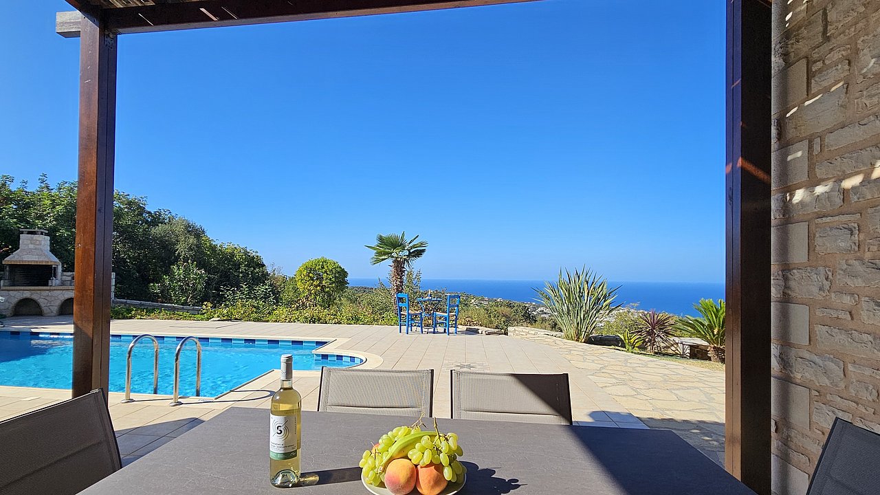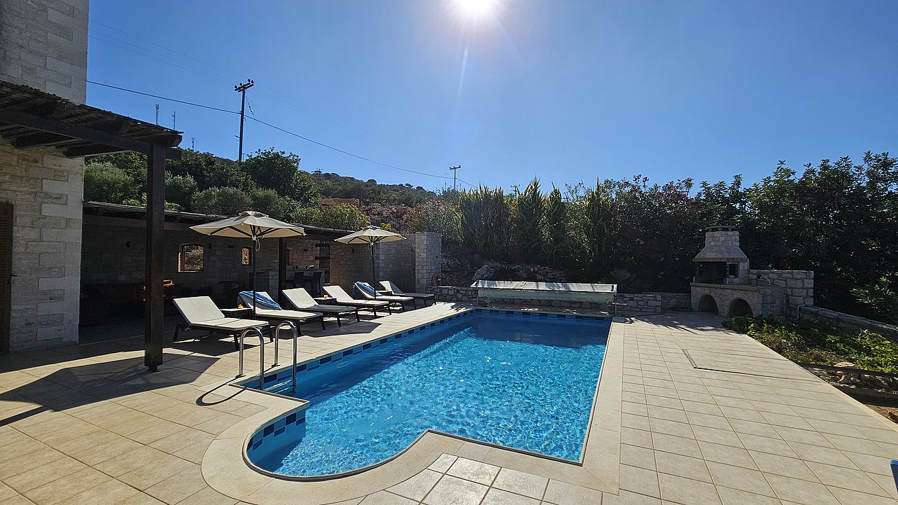 Familien oder Paare, die eine traditionelle Natursteinvilla mit privatem Pool, mediterranem Flair und Meerblick suchen – in ruhiger Lage nahe Gerani und Rethymno.