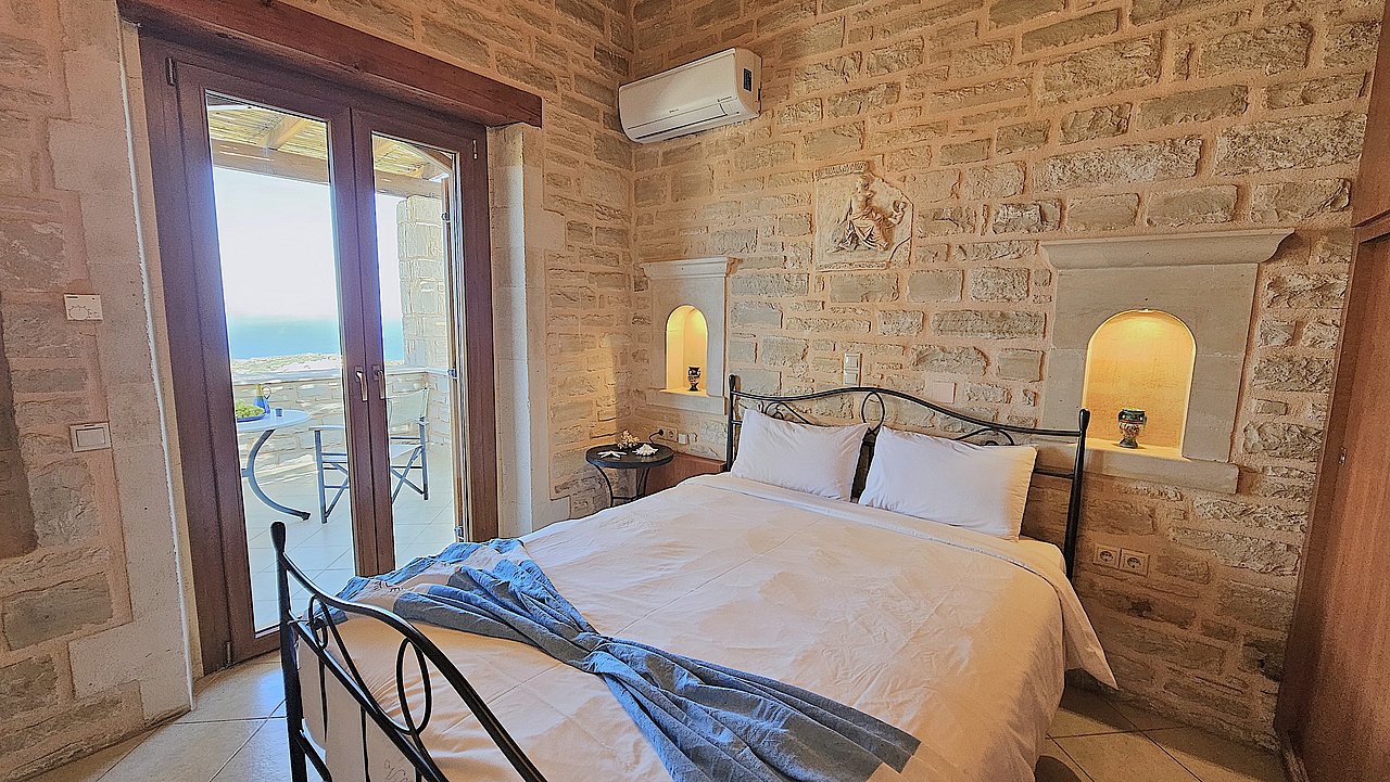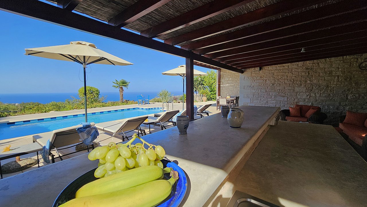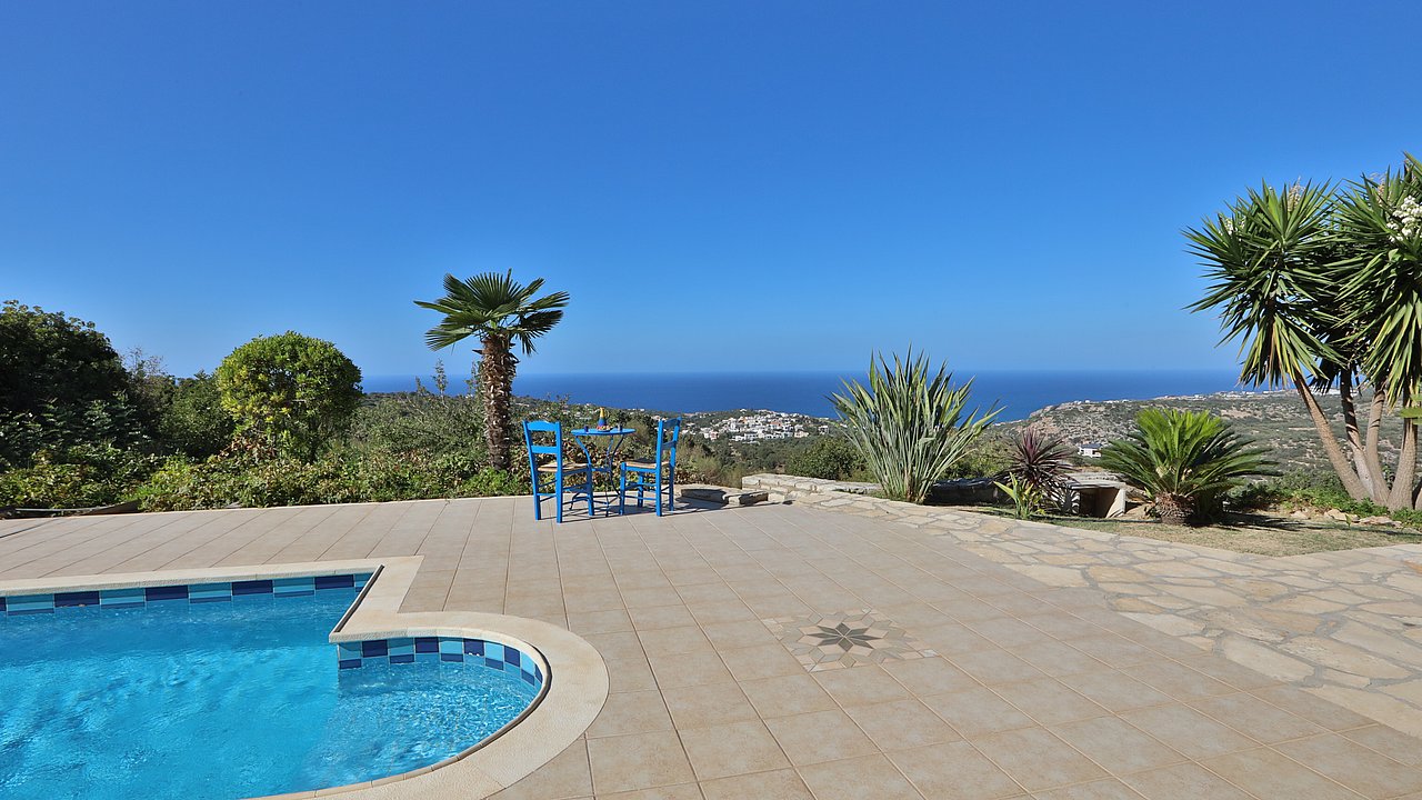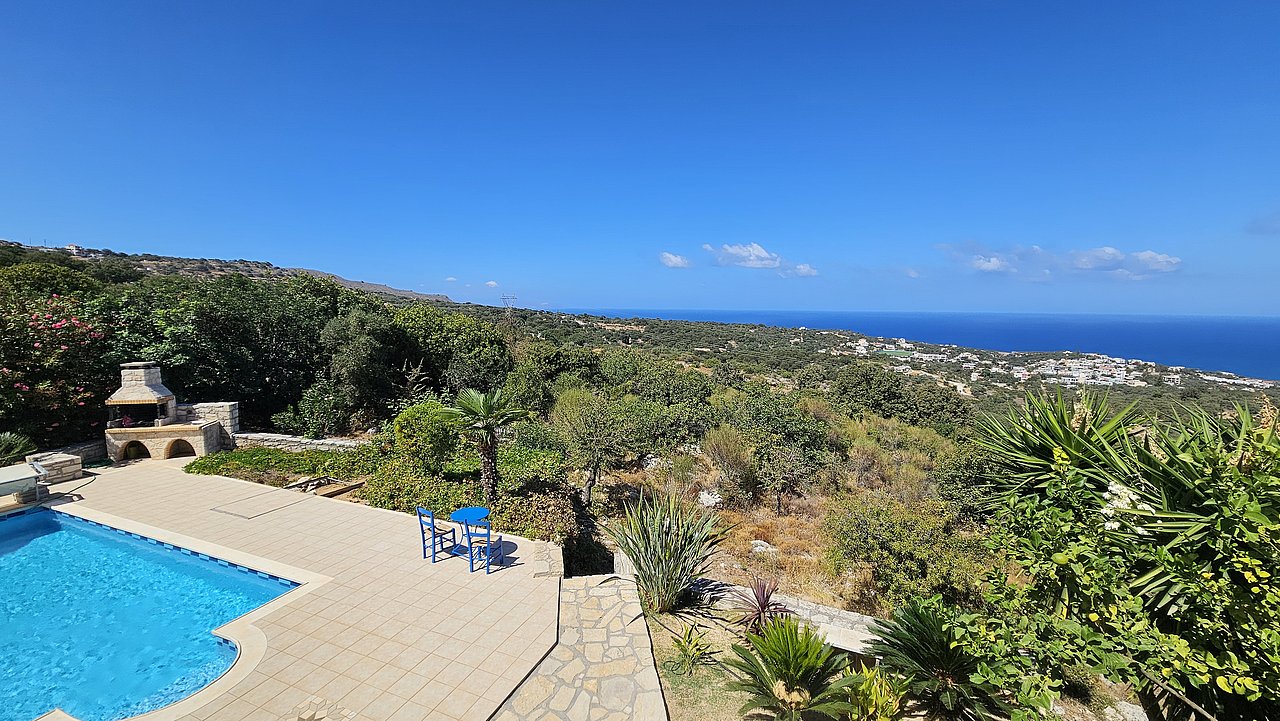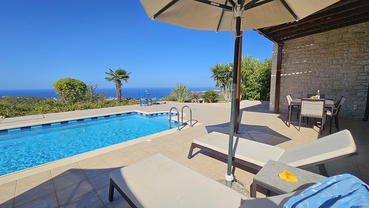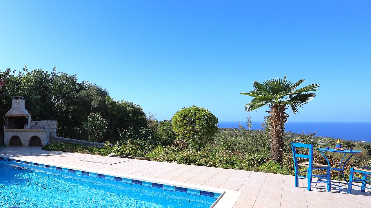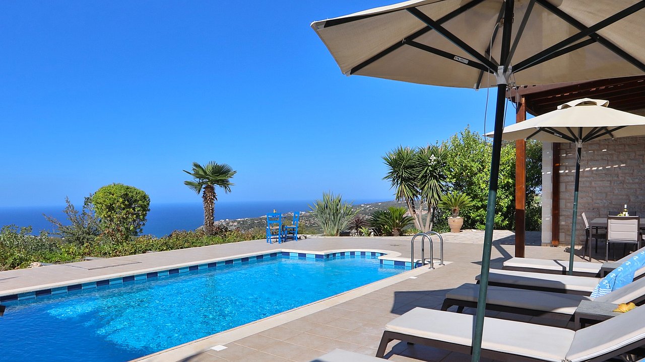 Familien oder Paare, die eine traditionelle Natursteinvilla mit privatem Pool, mediterranem Flair und Meerblick suchen – in ruhiger Lage nahe Gerani und Rethymno.