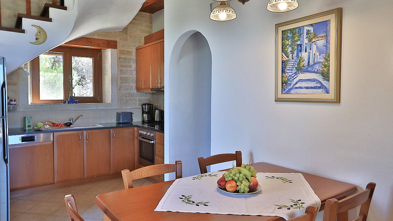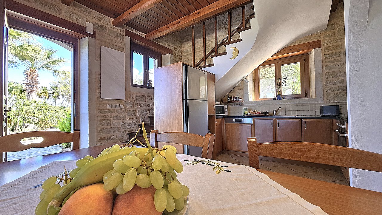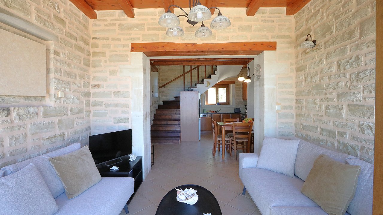Der gemütliche Wohn-/Essbereich ist mit TV, DVD-Player und Stereoanlage ausgestattet. Traditionelle Stein-Details und Rundbögen unterstreichen das mediterrane Flair.
