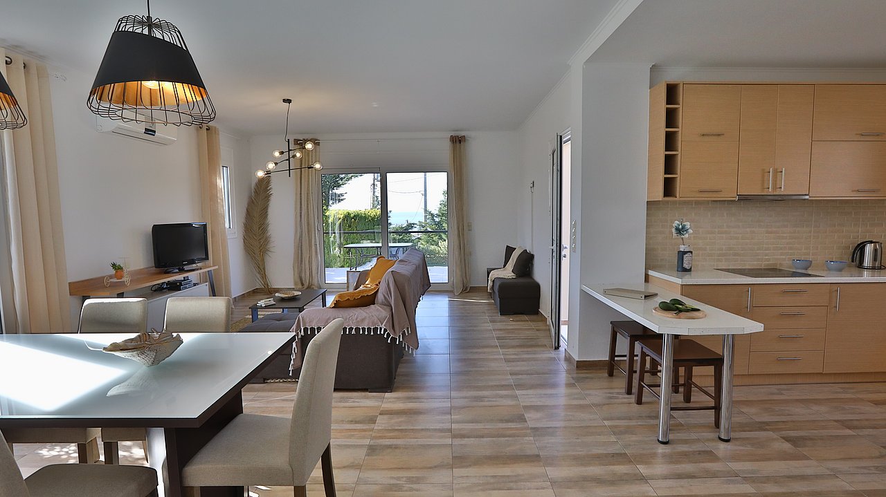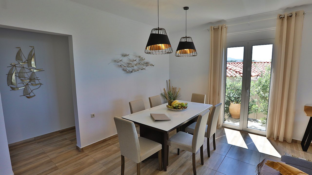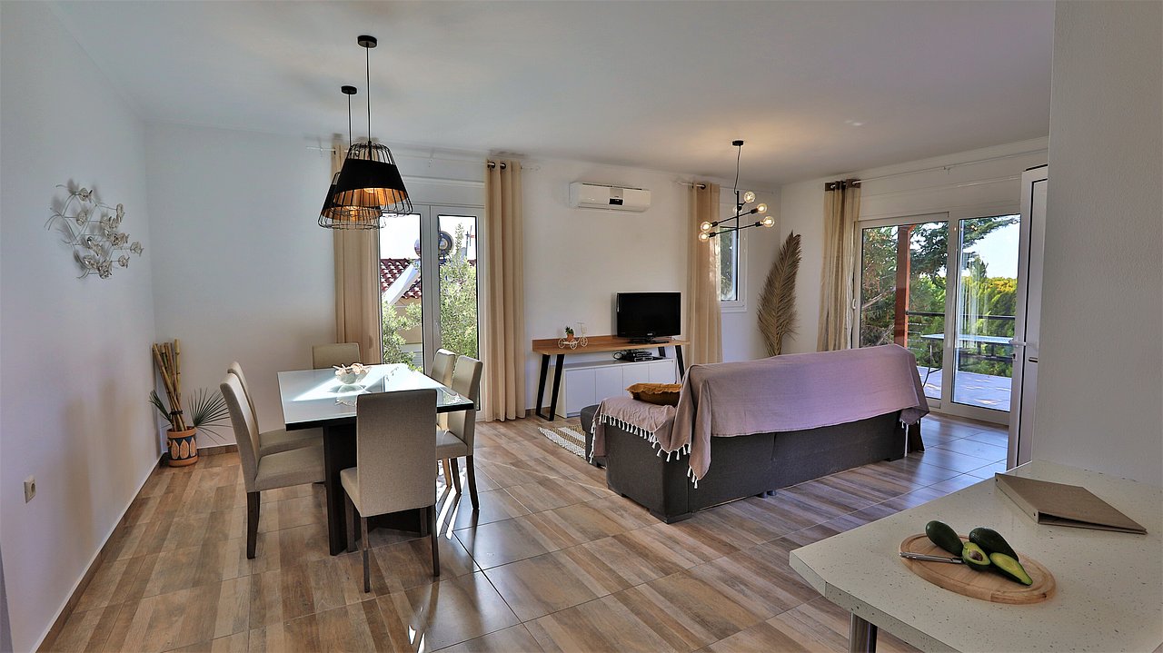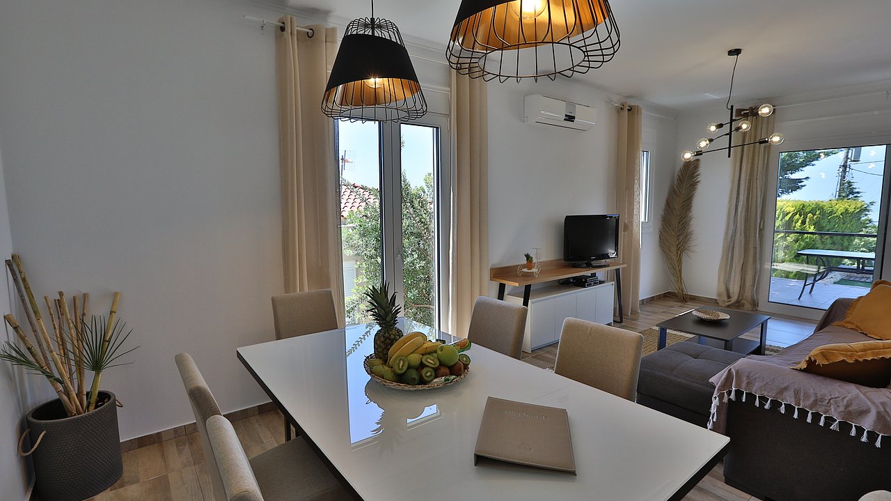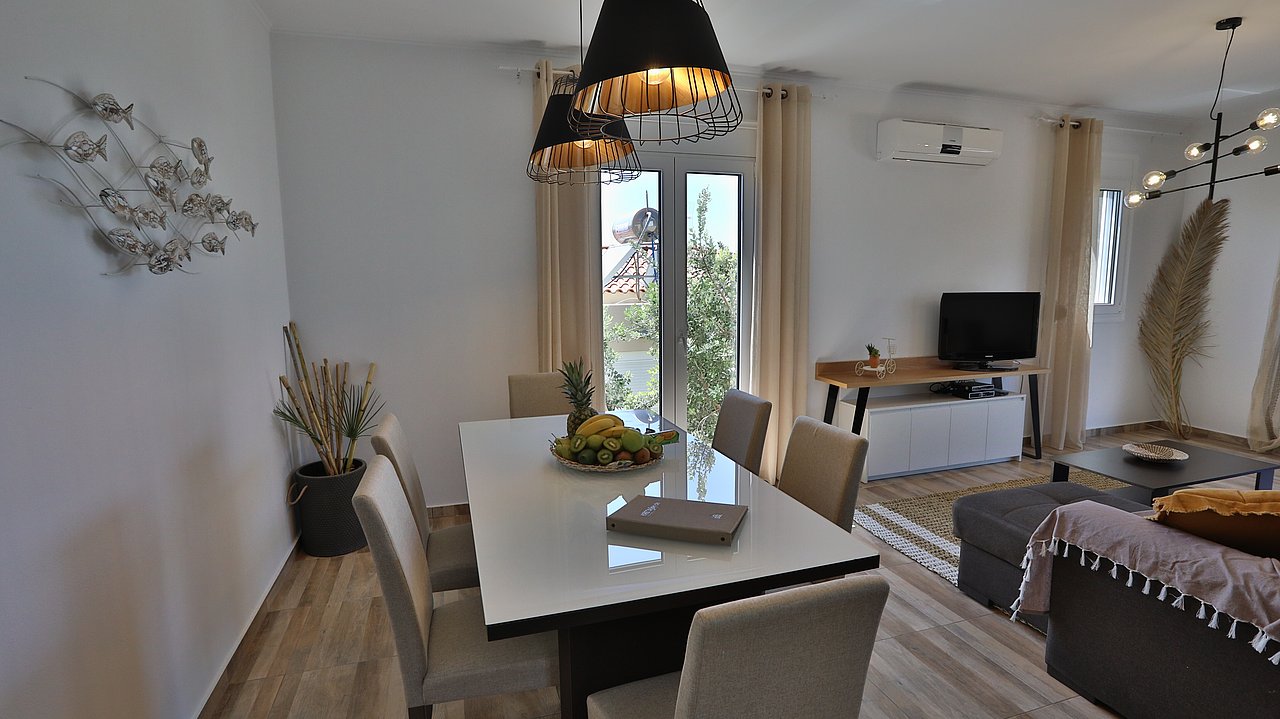 Die elegante Villa Meli liegt eingebettet in Olivenhainen bei Adelianos Kampos, nur ca. 800 m vom Strand entfernt. Auf rund 104 m² Wohnfläche bietet sie Platz für bis zu 5 Gäste. Gemeinsam mit der benachbarten Villa Canella teilt sie sich ein großes Grundstück, genießt aber durch die geschickte Ausrichtung volle Privatsphäre. Mit privatem Pool, modernen Annehmlichkeiten und mediterranem Flair ist sie der ideale Ort für entspannte Urlaubstage.