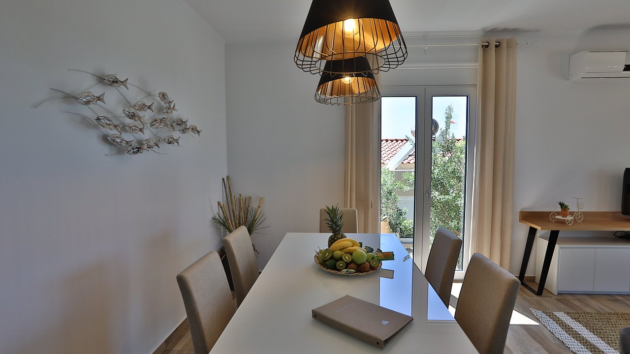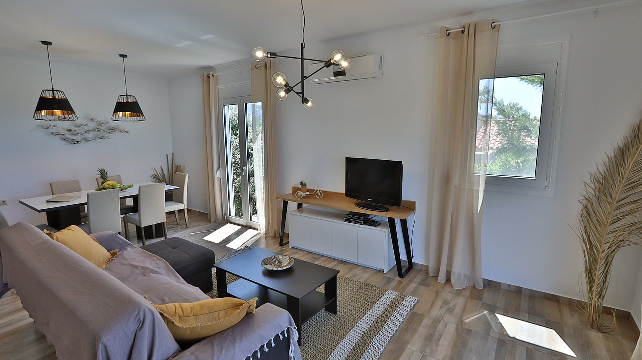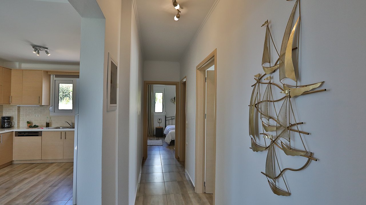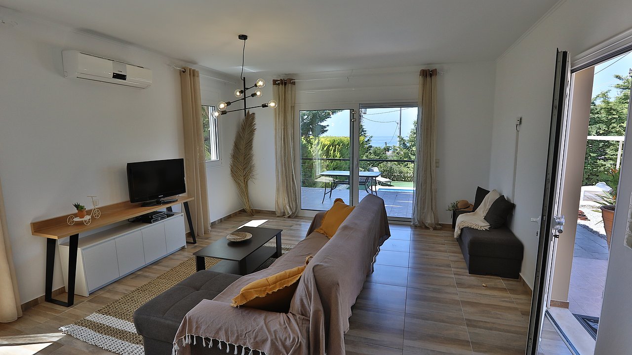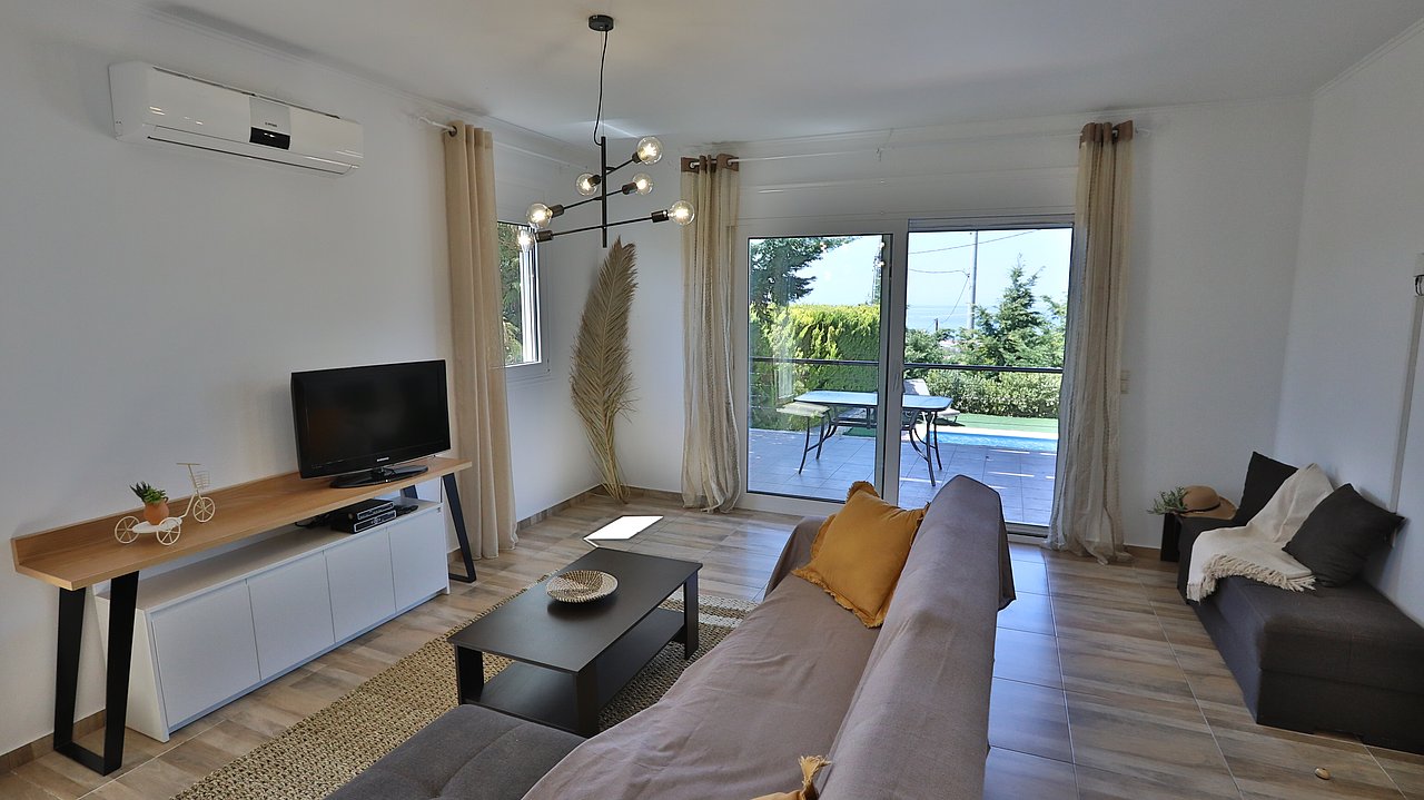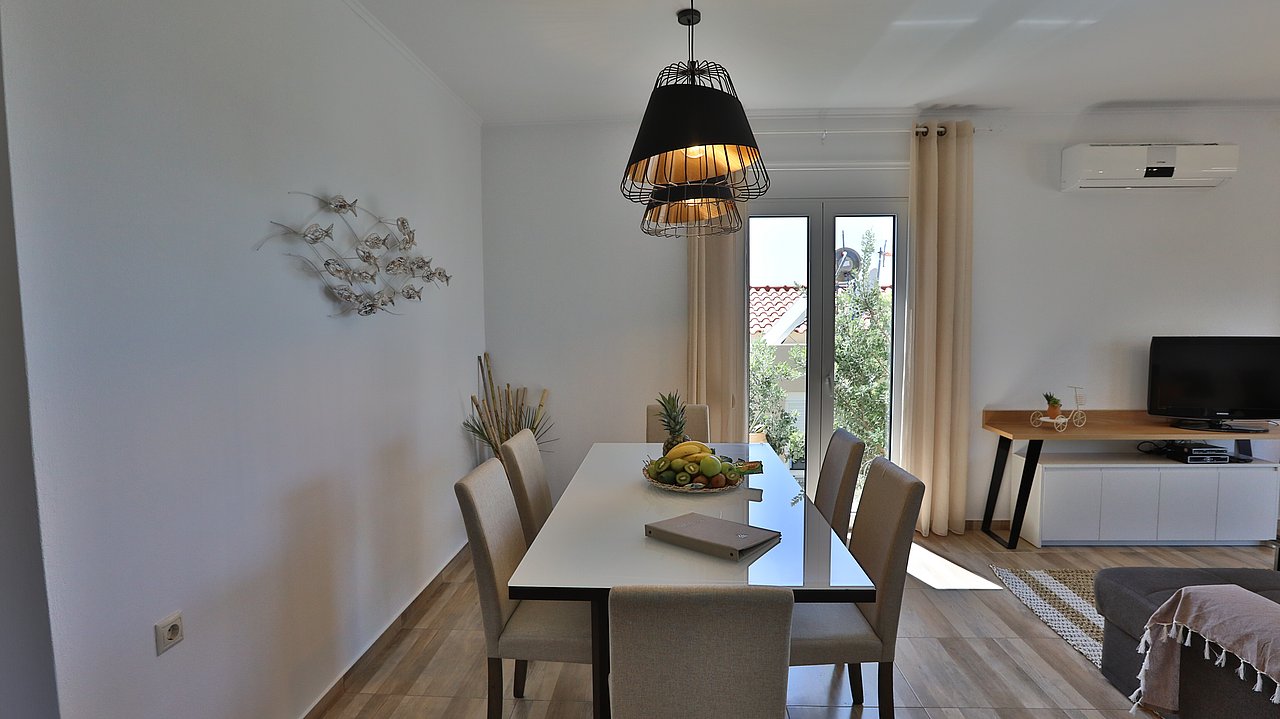 Die elegante Villa Meli liegt eingebettet in Olivenhainen bei Adelianos Kampos, nur ca. 800 m vom Strand entfernt. Auf rund 104 m² Wohnfläche bietet sie Platz für bis zu 5 Gäste. Gemeinsam mit der benachbarten Villa Canella teilt sie sich ein großes Grundstück, genießt aber durch die geschickte Ausrichtung volle Privatsphäre. Mit privatem Pool, modernen Annehmlichkeiten und mediterranem Flair ist sie der ideale Ort für entspannte Urlaubstage.
