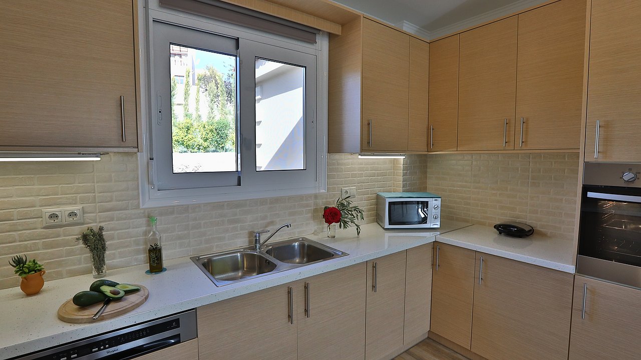 Die angrenzende Küche ist vollständig ausgestattet, u.a. mit: