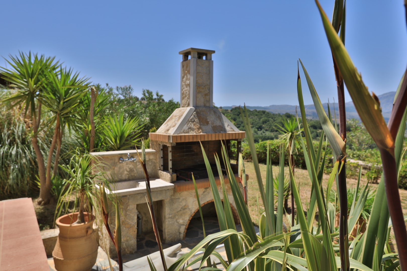 Der mediterrane Garten und die großzügige Terrasse sind perfekt für entspannte Urlaubstage: