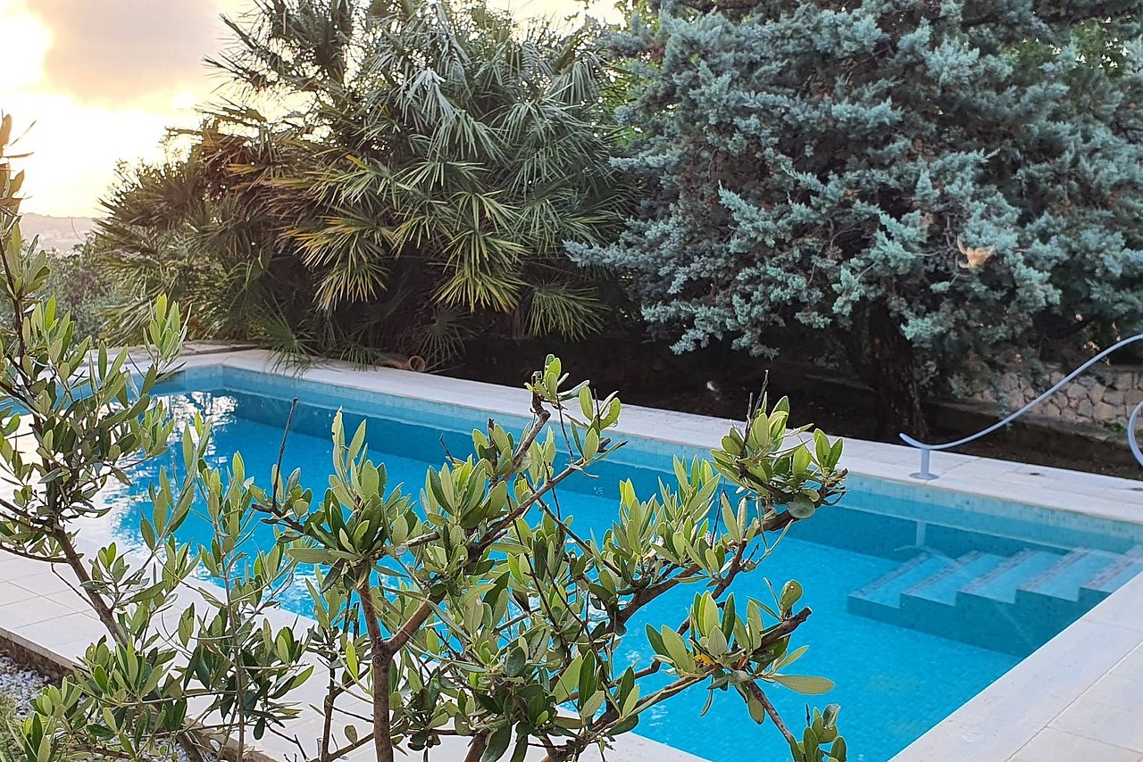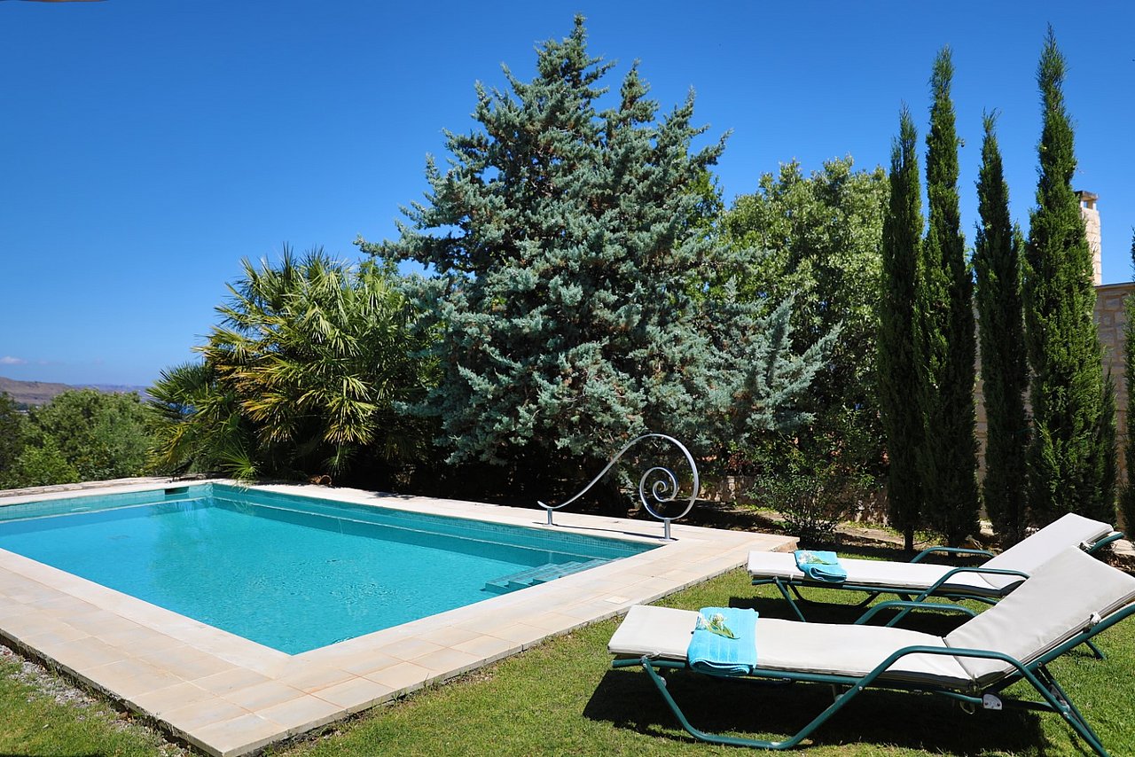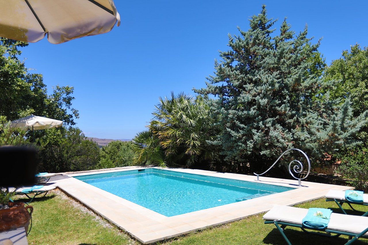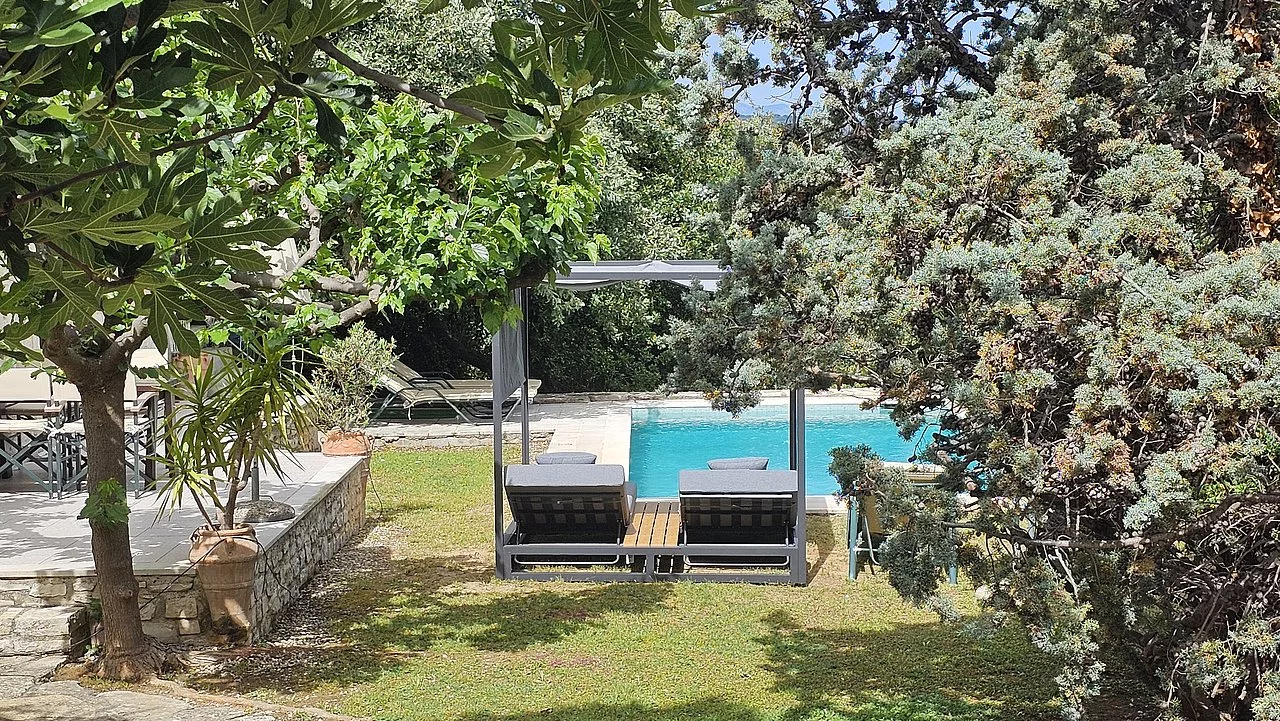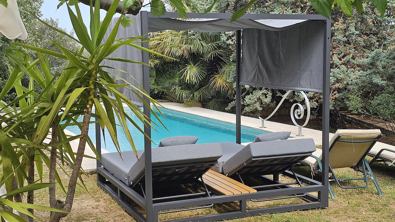 • Swimmingpool (ca. 8 × 4 m, ca. 35 m2) mit Sonnenschirmen, Liegen und Außendusche